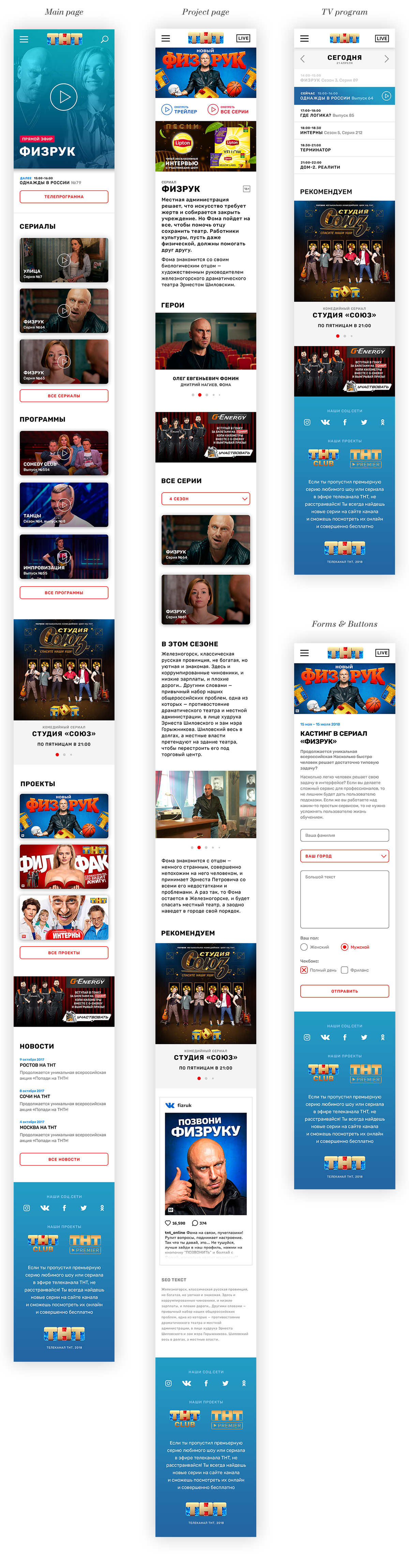The main page with Live stream, popular episodes on the week, the list of all of series and shows, promo-banners and other useful information for visitors